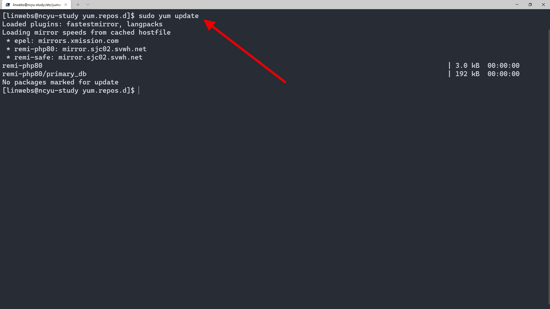 sudo yum update 更新軟體來源,此時可看到 remi-php80 軟體來源已被讀取。