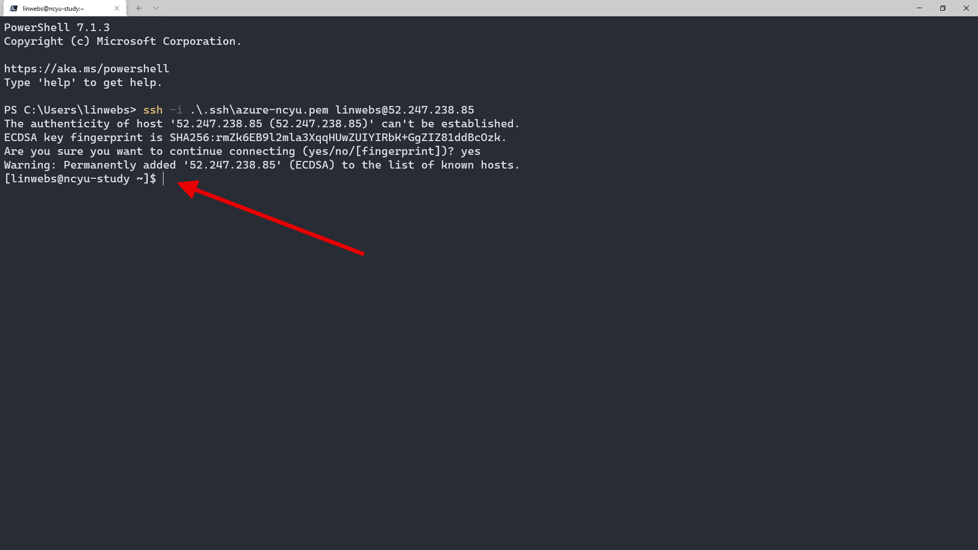 [使用者名稱@虛擬機器名稱 ~]$ 即代表您已成功連線到此機器。