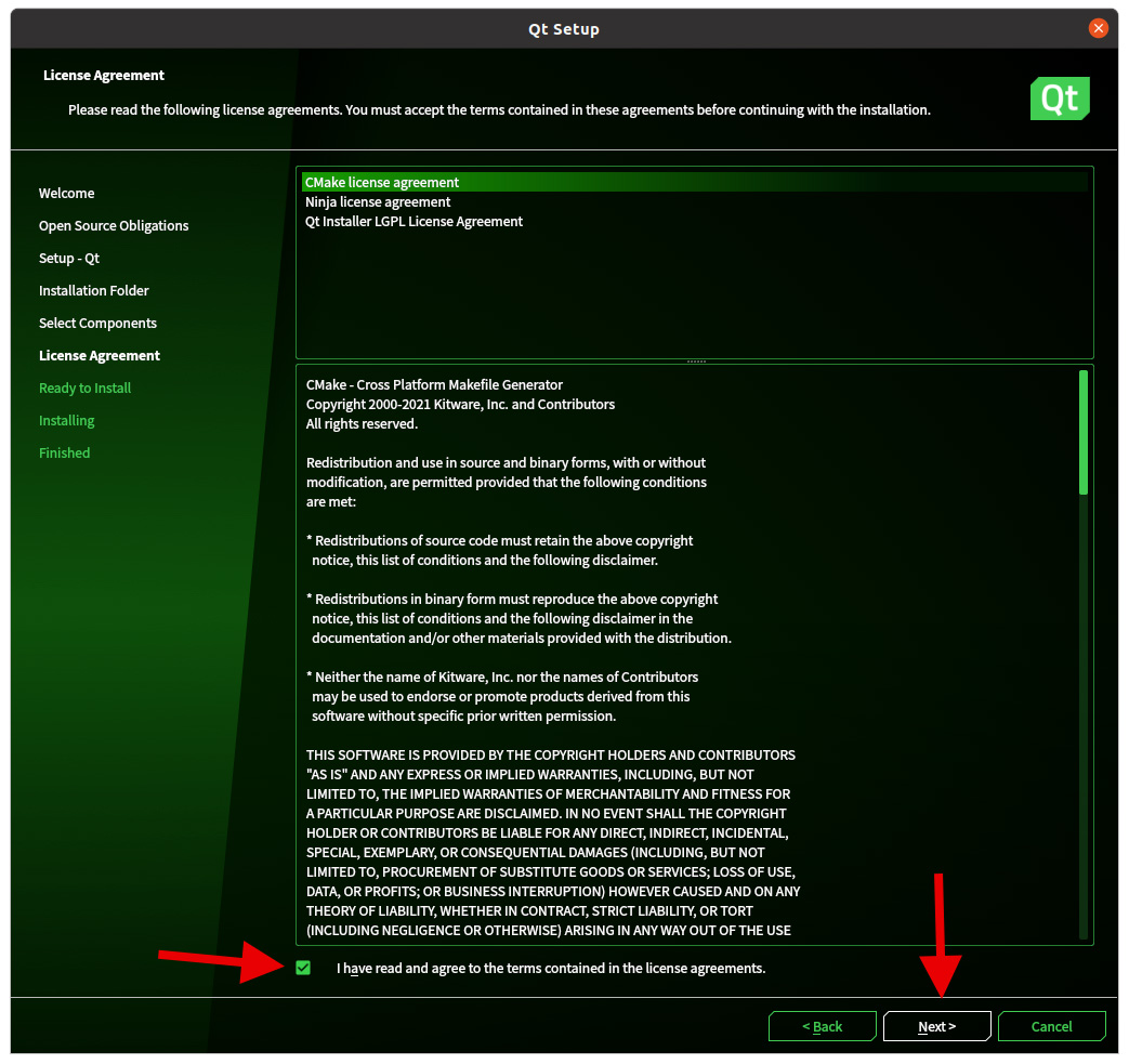 ls 指令查看目錄下的檔案。sudo 指令(root 權限)執行 chmod 變更權限讓所有使用者擁有執行此檔案的權限。ls -la 指令查看此檔案的權限。sudo 指令(root 權限)執行此檔案 ./qt-unified-linux-x64-4.1.0-online.run。